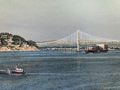 I built four canvases, each 1.5 x 7 feet (.46 x 2.13 meters). The composition took in almost 180 degrees, from Emeryville to the Marin Headlands. Our eyes don't operate in that range, so I'd need to look straight at a piece, then move to the next, leaving a breadcrumb trail from left to right. At the start, I attempted to negotiate the progression in my head. This did not work. The drawing looked wrong. After six months I realized the best thing I could do was to remove the canvases from their frames, stretch new canvas and start over.